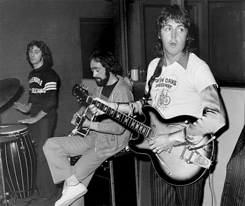 Con Paul McCartney colaboró durante las sesiones del álbum Venus and Mars, 5 años después: «En febrero de 1975, toqué en un local histórico llamado The Warehouse en New Orleans. Denny Laine y Jimmy McCulloch de Wings vinieron a mi concierto y, después, me invitaron a los estudios Sea-Saint de Allen Toussaint al día siguiente. Por suerte, tenía el día libre. Paul McCartney estaba allí grabando lo que se convertiría en el álbum ‘Venus and Mars’. Lo pasamos genial. Siempre me ha encantado estar con Denny, uno de mis favoritos desde que lo escuché cantar «Go Now» por primera vez cuando estaba con The Moody Blues. El resto de la banda era genial, ¿y qué decir de Paul McCartney? De todos los músicos de mi generación, para mí es el más insuperable. Simplemente el mejor. Así que terminé tocando la guitarra en «Listen to What the Man Said», lanzado ese mismo día de 1975, y, como era de esperar, se convirtió en número uno. Aquí [en la foto] estamos trabajando en la canción (y ese es Denny a la izquierda, añadiendo percusión). Aunque Warehouse y Sea-Saint ya no están (junto con Jimmy), Paul, Denny y yo seguimos aquí, haciendo música y creyendo en el poder del rock and roll. Y si algo he aprendido… es que si Paul McCartney te pide que toques en algo, simplemente escucha lo que te dice«.