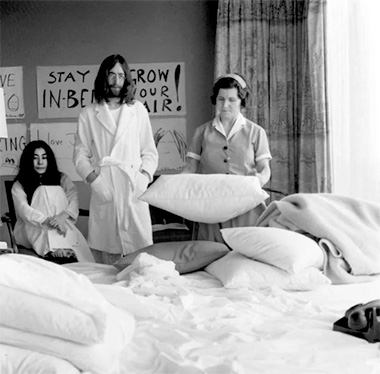 La foto, de marzo de 1969, en la pareja espera que la empleada termine de organizar el cuarto al lado de su cama en el Hotel Hilton de Amsterdam durante su «bed-in» contra la guerra de Vietnam, es constantemente sujeto de crítica por parte de algunos pseudo justicieros sociales que insisten en hablar de la situación como irónica.
